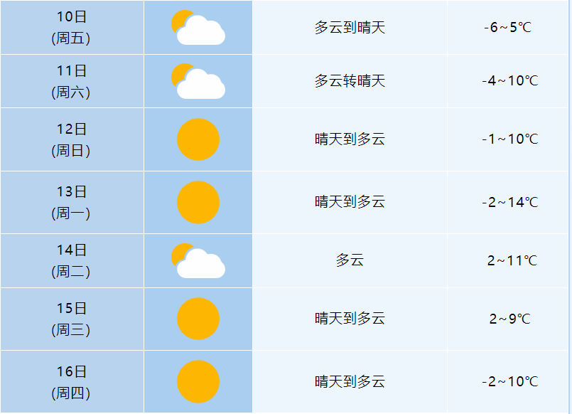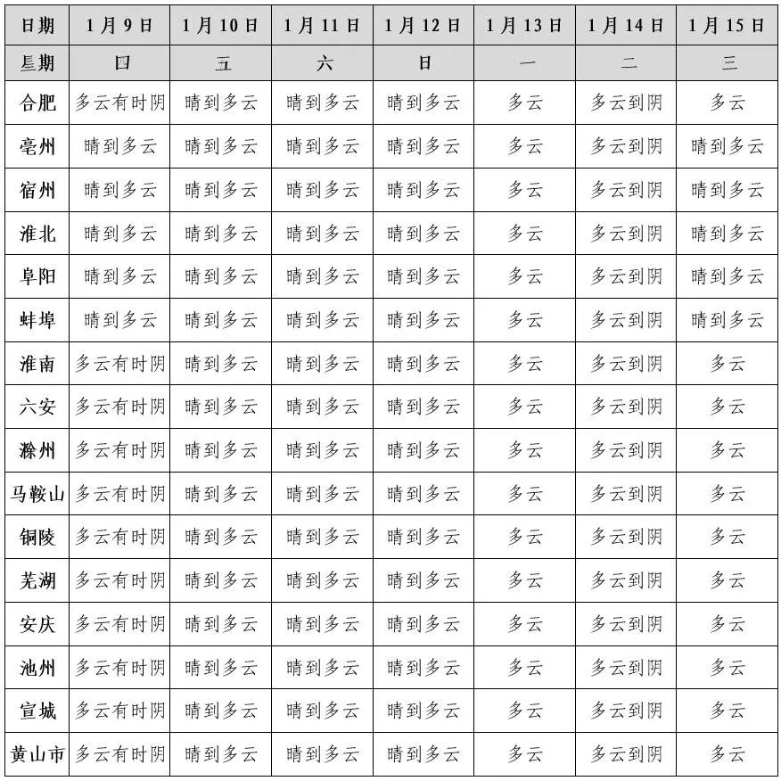 据安徽气象:未来一周全省以多云到晴天为主。受冷空气影响,10日早晨全省最低气温-7~-4℃。10日至14日白天全省气温逐渐回升,14日白天江南部分地区最高气温升至16~18℃。14日夜里至16日还有一股冷空气影响我省,全省平均气温将下降3~6℃,同时14日夜里至15日白天全省偏北风力增至3~4级,阵风7级左右。