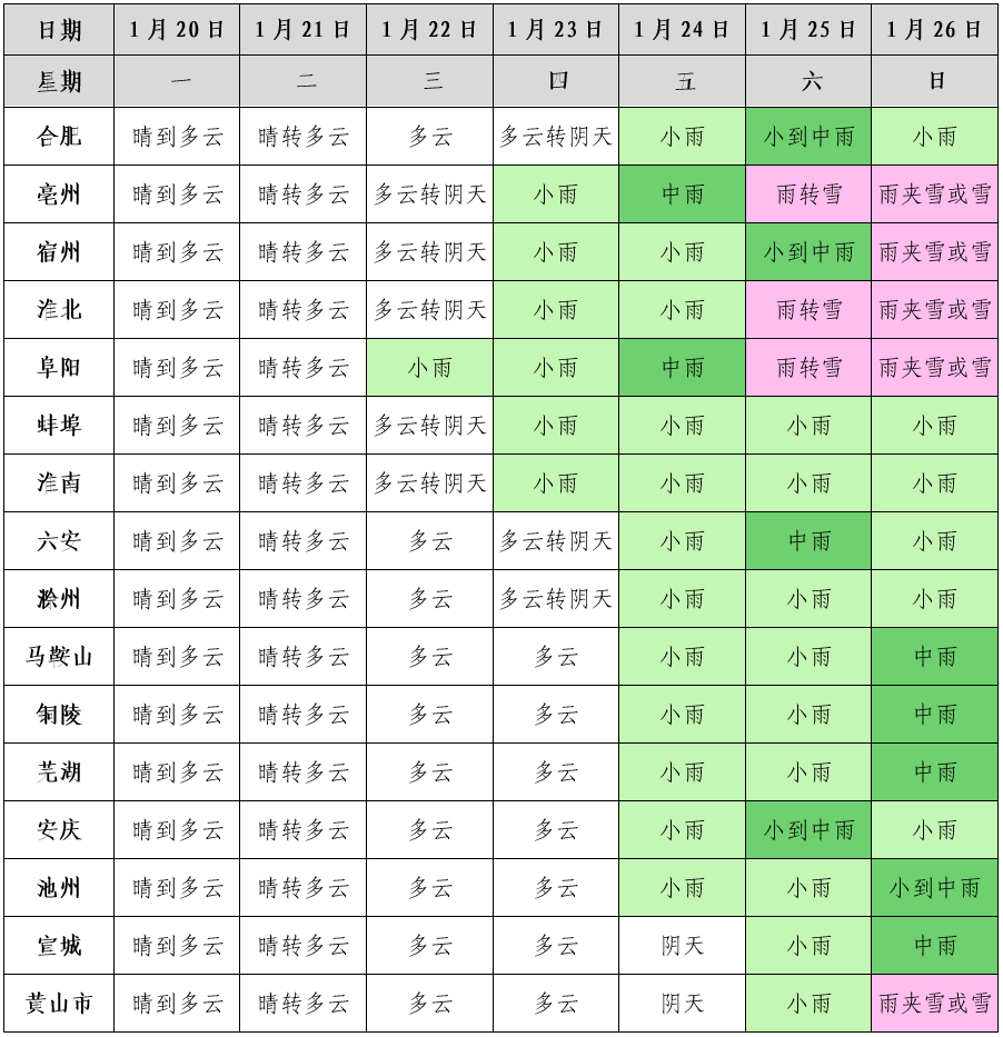 主要降水时段为24日至26日,全省普遍有中雨,过程累计降水量10~20毫米;25日夜里至26日淮北地区、大别山区和皖南山区的部分地区有小雨转雨夹雪或雪。未来十天其他时段全省以晴到多云天气为主。