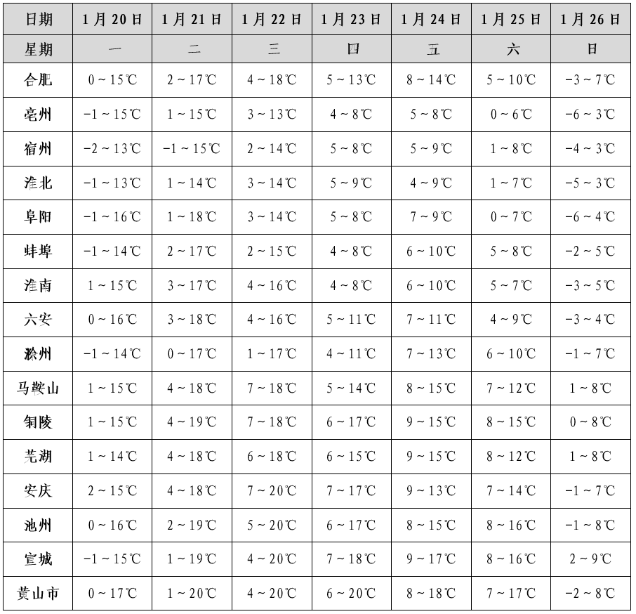 26日至27日有强冷空气影响我省。今明两天全省气温继续回升,21日淮北地区东部最高气温14~16℃,本省山区18~20℃,江南16~18℃。22-25日受降水影响,江北最高气温有所下降。