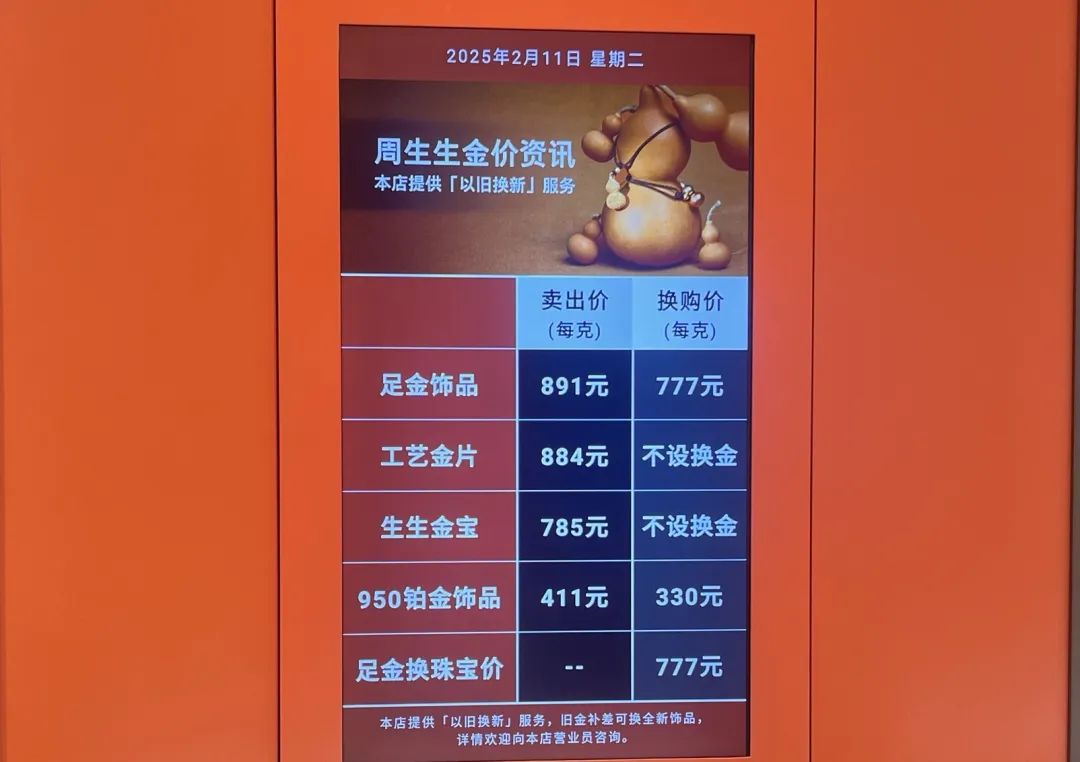 在周生生店内悬挂的金价资讯表上,该品牌2月11日黄金饰品卖出价是891元/克。