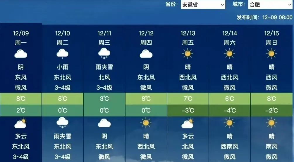 10日小雨转雨夹雪,东北风3-4级,温度0~8℃。