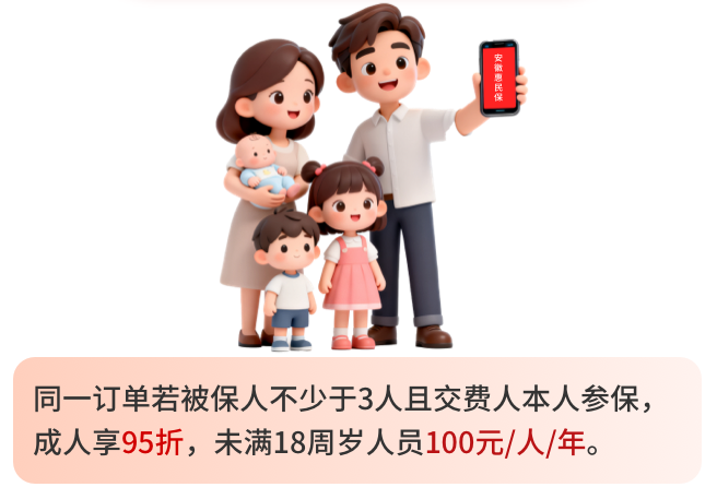 守护全家人的保障,就选“安徽惠民保”,家庭一起参保满3人或3人以上的,成人还可享受95折优惠,切实进一步降低家庭参保成本。