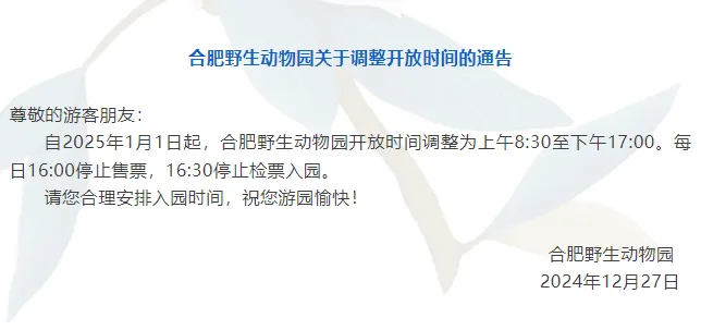 刚刚,合肥野生动物园发布通告开放时间将调整。