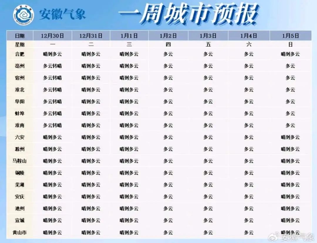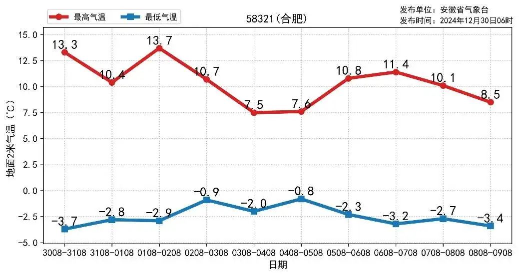 安徽省气象台预报,未来十天全省仍以晴到多云天气为主,有三次弱冷空气活动,分别出现在2024年12月30日至31日、2025年1月2日至3日和7日至8日,其余时间全省气温以回升为主。